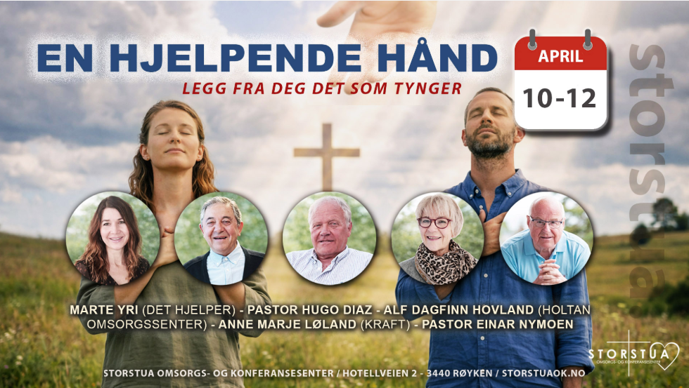 Velkommen til møtehelgen «En hjelpende hånd» 10. – 12 april. Dette er en helg hvor du kan legge av det som tynger, finne ro og rette blikket mot Jesus Kristus. Sammen søker vi Guds nærvær, ber for hverandre og åpner hjertet for den legedommen bare Han kan gi.